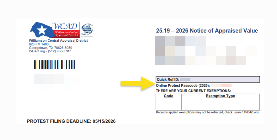The QuickRef ID and Online Protest Passcode can be found on the Notice of Appraised Value.