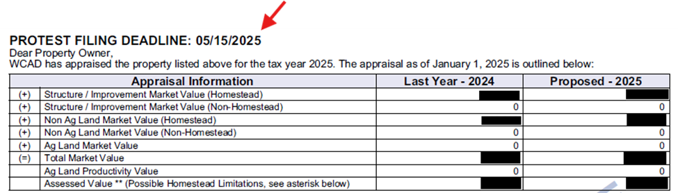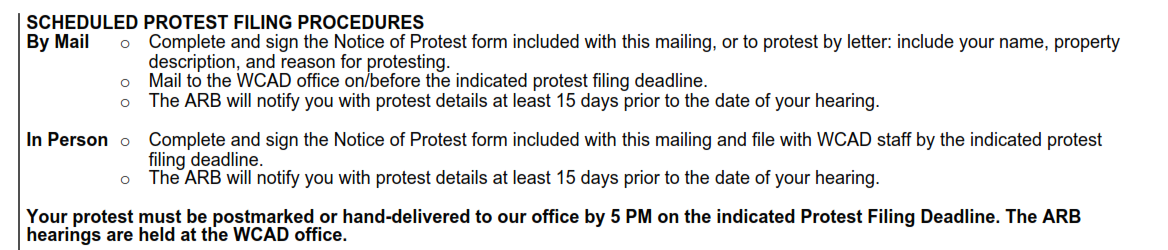 The 2025 protest deadline was May 15, 2025 The deadline for filing a protest was posted on the appraisal notice to file by May 15th, or 30 days from the mail date on your Notice of Appraised Value. If a deadline falls on a weekend or legal holiday, ...