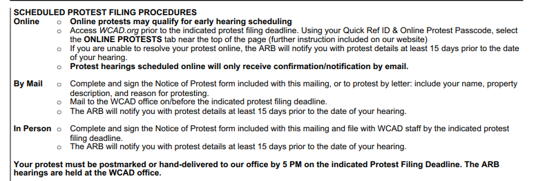 Specific accounts may have online filing available. It will be indicated on your NOAV under SCHEDULED PROTEST FILING PROCEDURES. The NOAV notice will also have an online passcode highlighted in red.